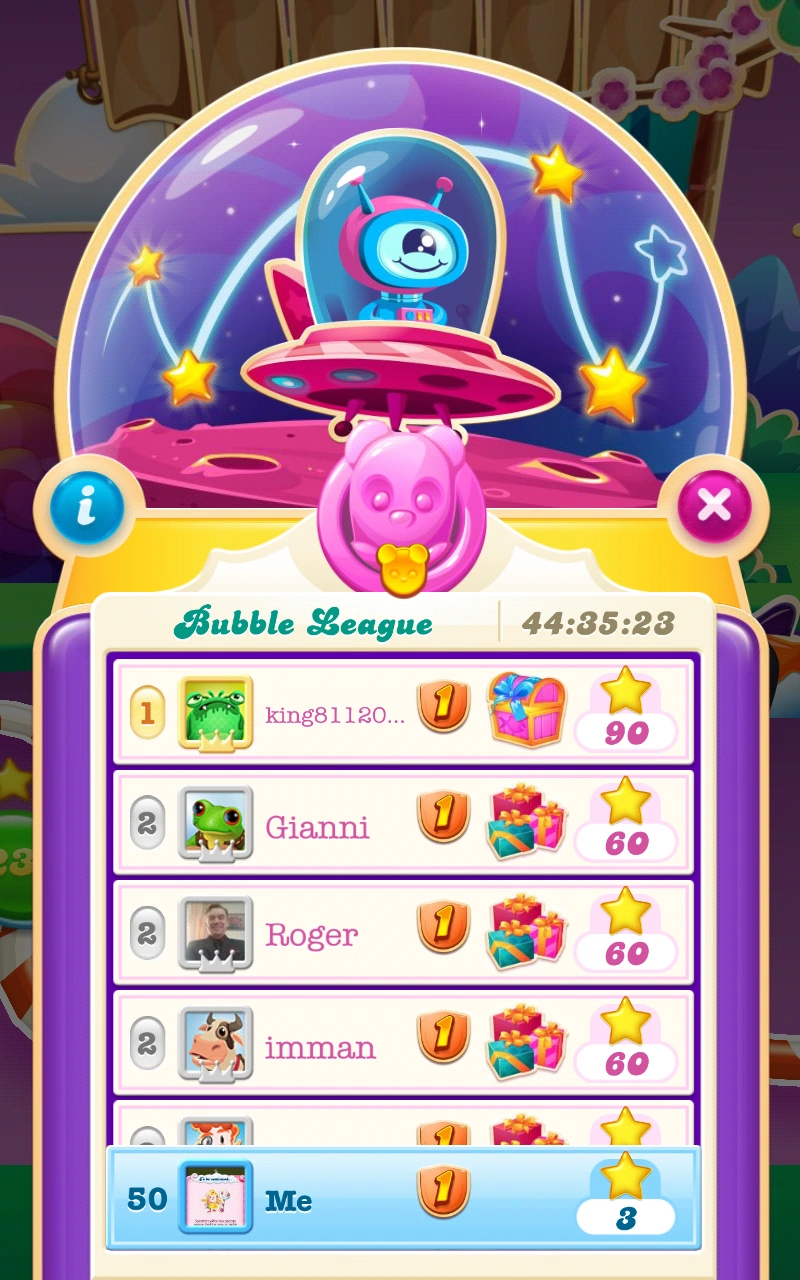 After the player plays at least one level for the stars and earns at least 3 stars (which s/he can keep only by winning the level), then the player can enter into a Contest against other players, his/her Facebook friends and some players from the King website.
