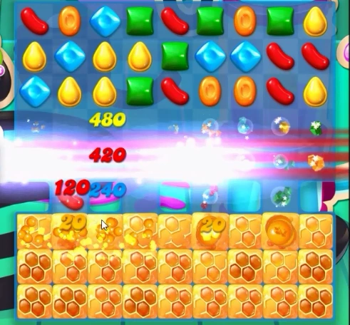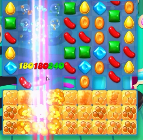 A striped candy is created when 4 candies (including special candies and bottles) of the same color form either a horizontal or vertical straight line. If 4 candies are matched in a row, a vertically striped candy is created. If 4 candies are matched in a column, a horizontally striped candy is created. When formed, 120 points are given to the player.